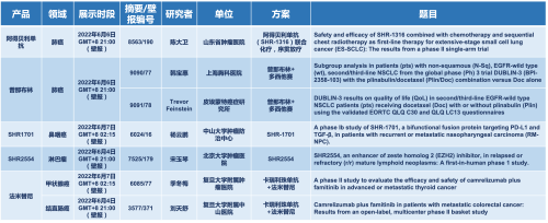 2022 ASCO年会另有5款永利皇宫官网医药上市前抗肿瘤创新药的相关研究被接收为壁报,包括SHR-1316、普那布林、法米替尼、SHR-1701和SHR2554,他们的单药或联合方案相关7项研究被接收为壁报,覆盖肺癌、鼻咽癌、淋巴瘤、甲状腺癌和结直肠癌等领域。