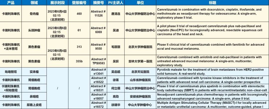 此外,在头颈肿瘤、黑色素瘤、骨肉瘤、鼻咽癌、肾细胞癌、尿路上皮癌等多个领域,卡瑞利珠单抗、吡咯替尼等产品相关研究一共入选了4项壁报展示和5项线上发表,彰显了永利皇宫官网医药强大的自主研发综合实力。