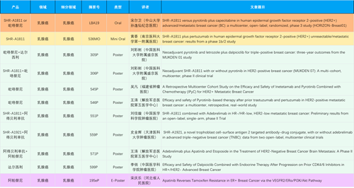 在乳腺癌领域,永利皇宫官网创新产品相关研究共入选1项口头报告、1项简短口头报告、8项壁报和1项电子壁报,共11项研究。吡咯替尼、达尔西利、阿得贝利单抗、瑞康曲妥珠单抗等新老创新药物,均有多篇研究入选,展现出永利皇宫官网医药在乳腺癌领域多年深耕的丰硕成果。